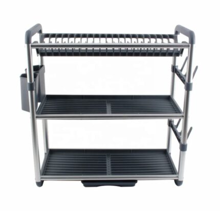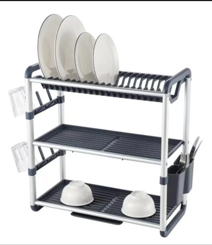 This is a 3-tier dish drying rack.It is made with an aluminium frame and plastic trays, designed for kitchen Organization.