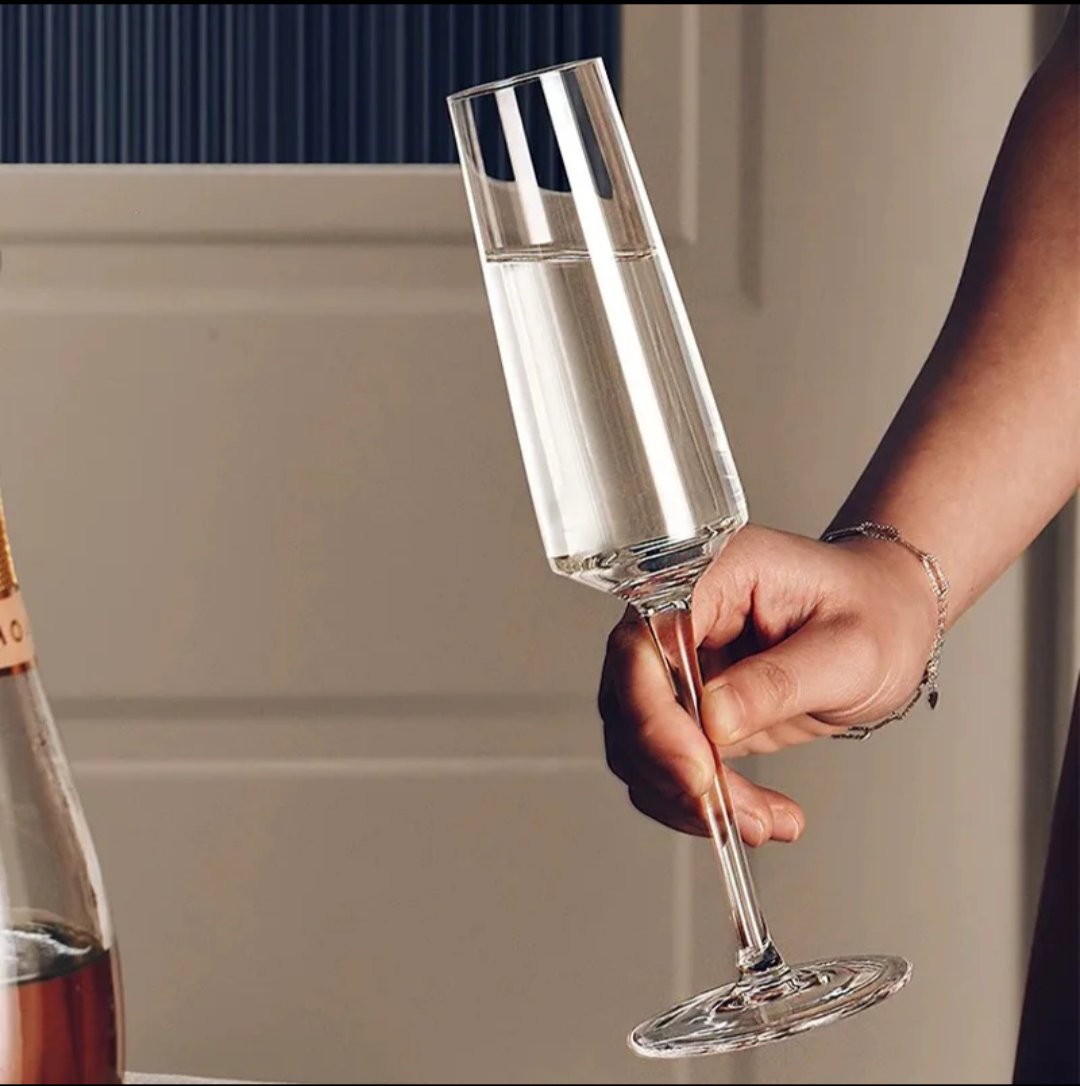 This is a champagne flute glass with a narrow and elongated bowl.It has long, slender stem and a wide flat base.