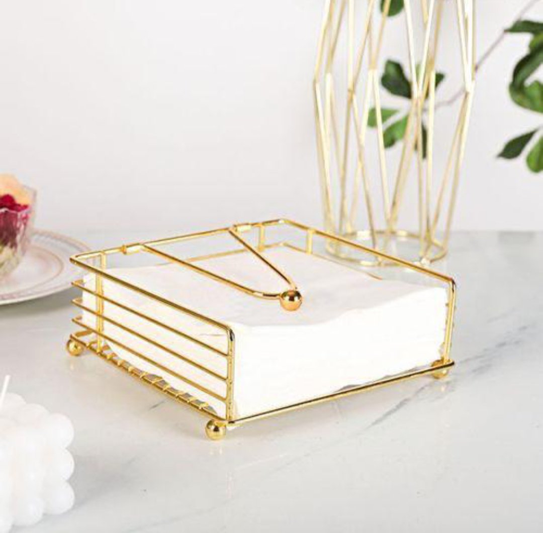 This is a gold wire napkin holder with a modern design, often used for organising paper napkins or serviettes on a dinning table, kitchen countertop or for outdoor use during picnics or parties.