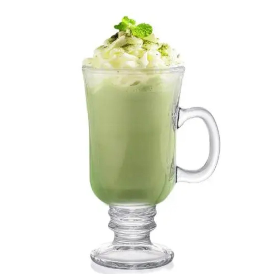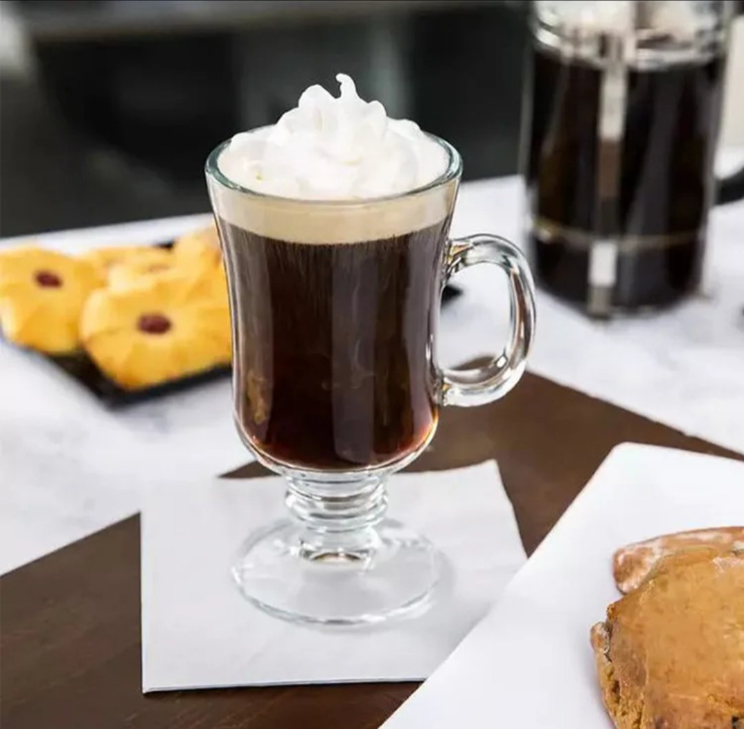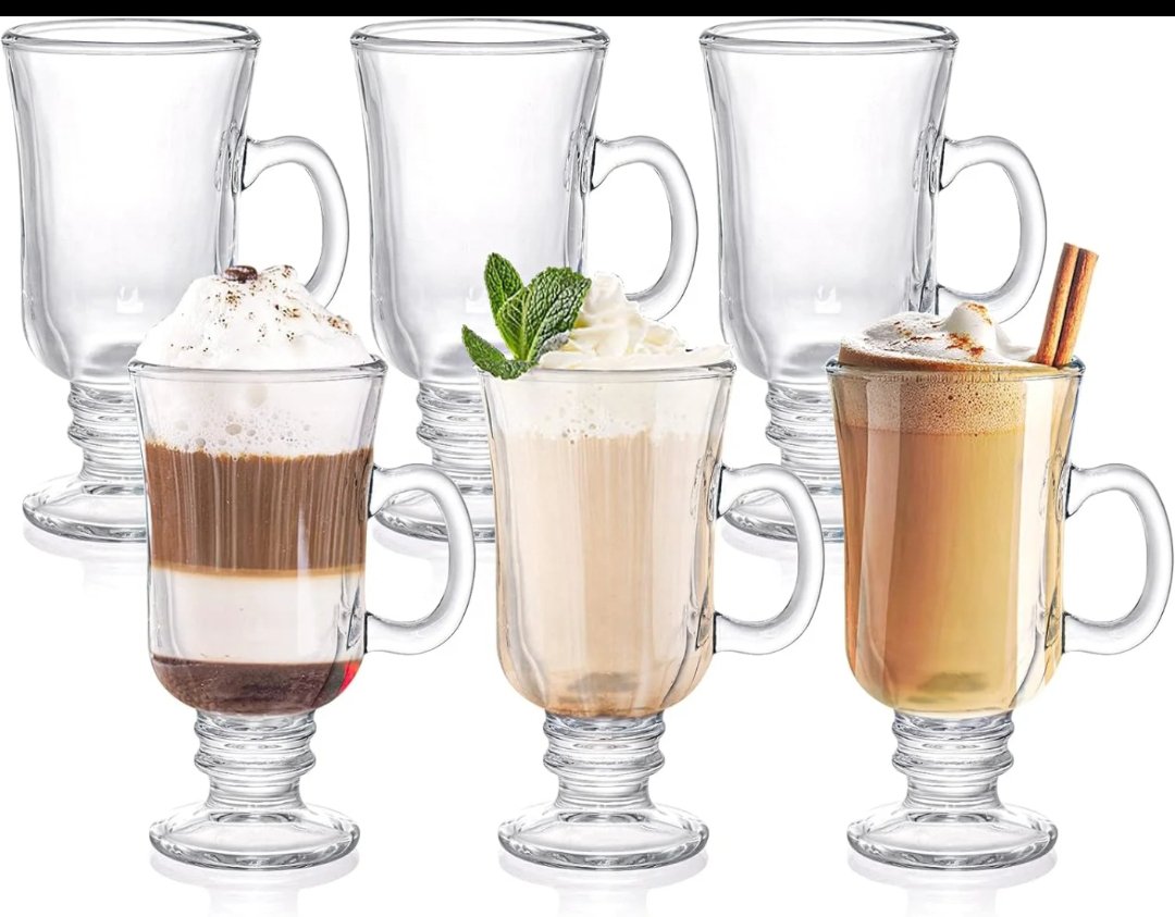 This is a latte mug.It is made of heat-resistant glass and a handle for easy grip,footed design provides stability.It is suitable for hot beverages such as Irish coffee, cappuccino and hot chocolate.Capacity is 250ML.