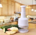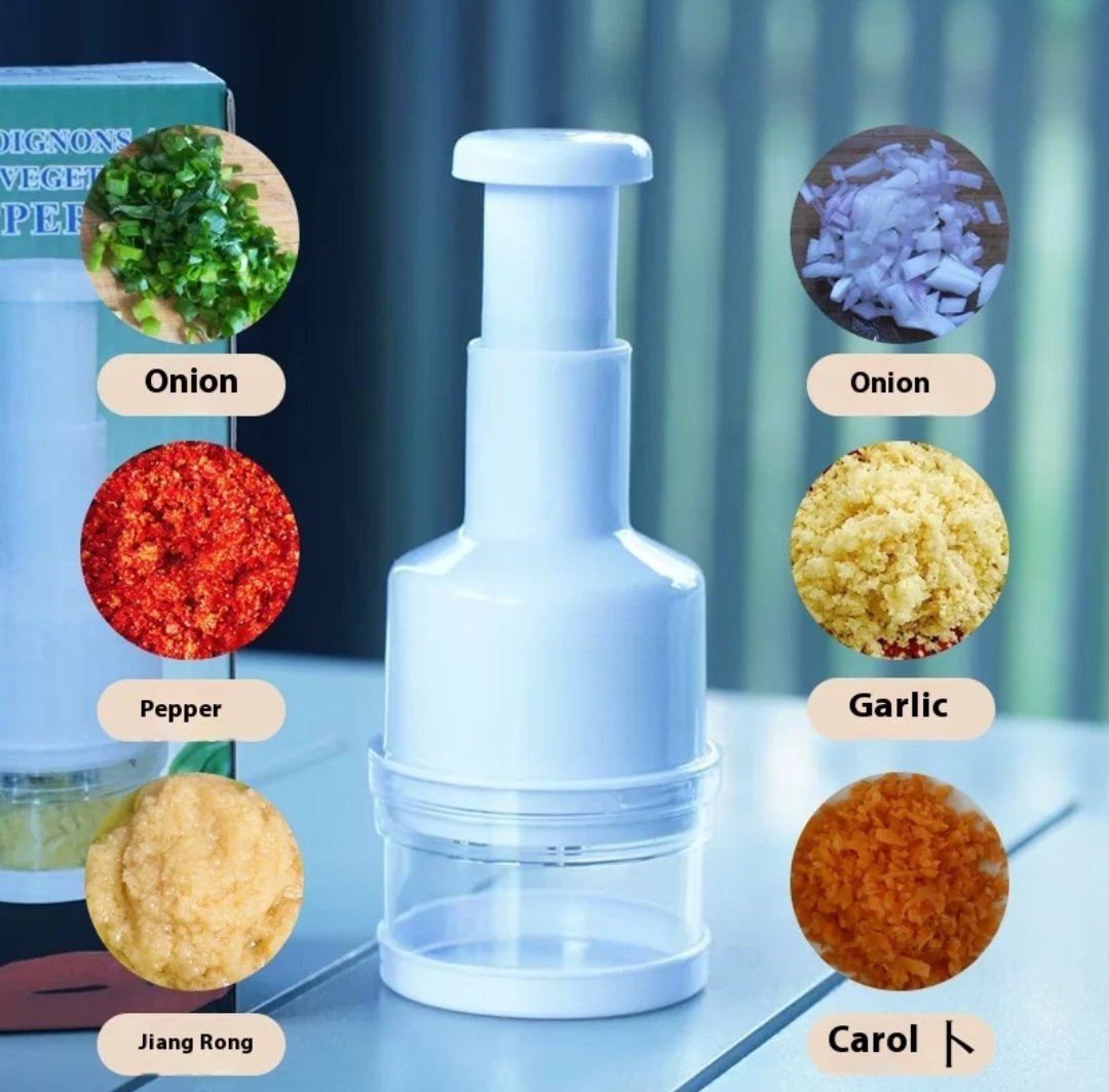This is a manual vegetable chopper or onion chopper.It’s designed for diving and chopping vegetables like onions, garlic and other produce quickly and easily by pressing down on the top.