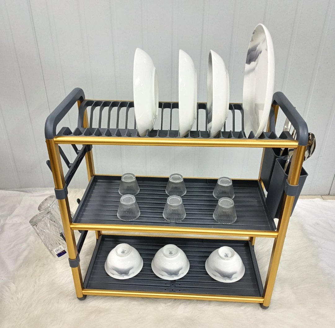 This is a 3-tier dish drying rack.It is made with an aluminium frame and plastic trays, designed for kitchen Organization.
