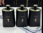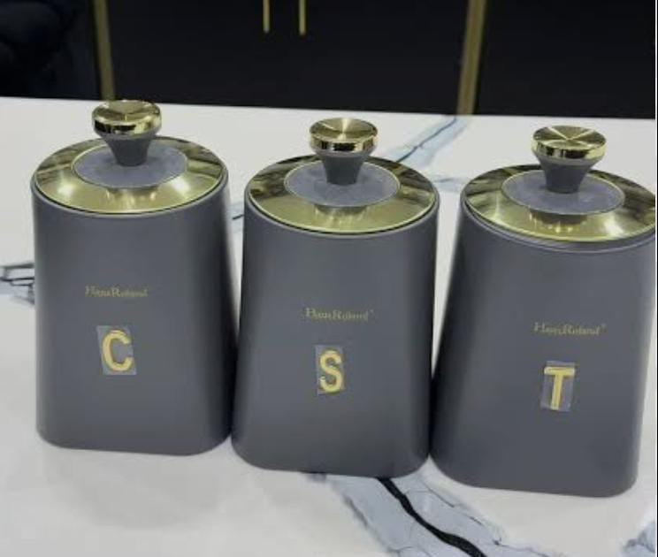 This is a Haus Roland 3-piece canister sets for tea, coffee and sugar.The set includes three canisters with a black and gold or grey and gold design,air-tight seals.Capacity is 1ltr each.